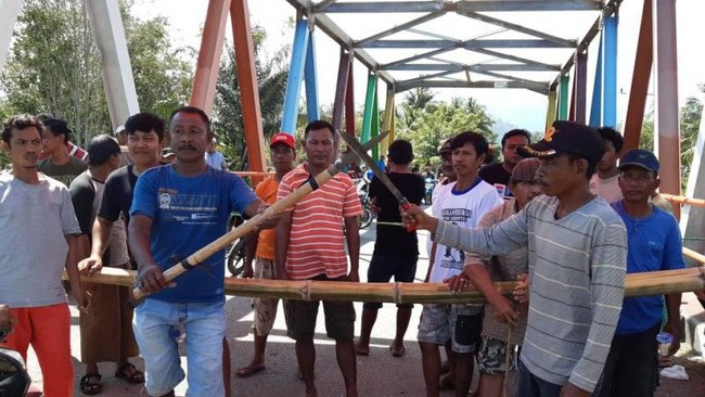 Warga memblokir jalan dengan bambu tepat di Jembatan Otabiu, Desa Tolinggula Ulu dan Tolite Jaya.