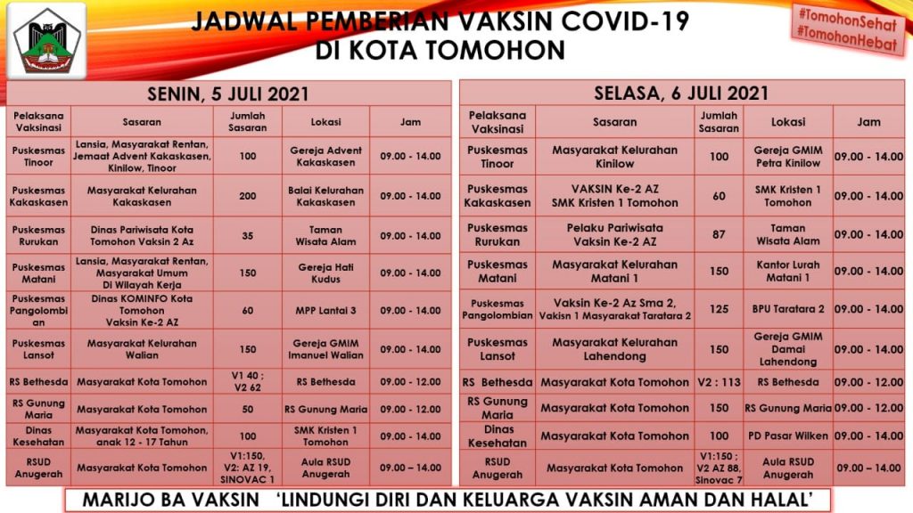 Pemerintah Kota Tomohon melalui bidang Promosi Kesehatan Dinas Kesehatan Kota Tomohon, kembali menerbitkan jadwal pemberian vaksin kepada masyarakat Kota Tomohon Senin Dan Selasa 05 – 06 Juli 2021