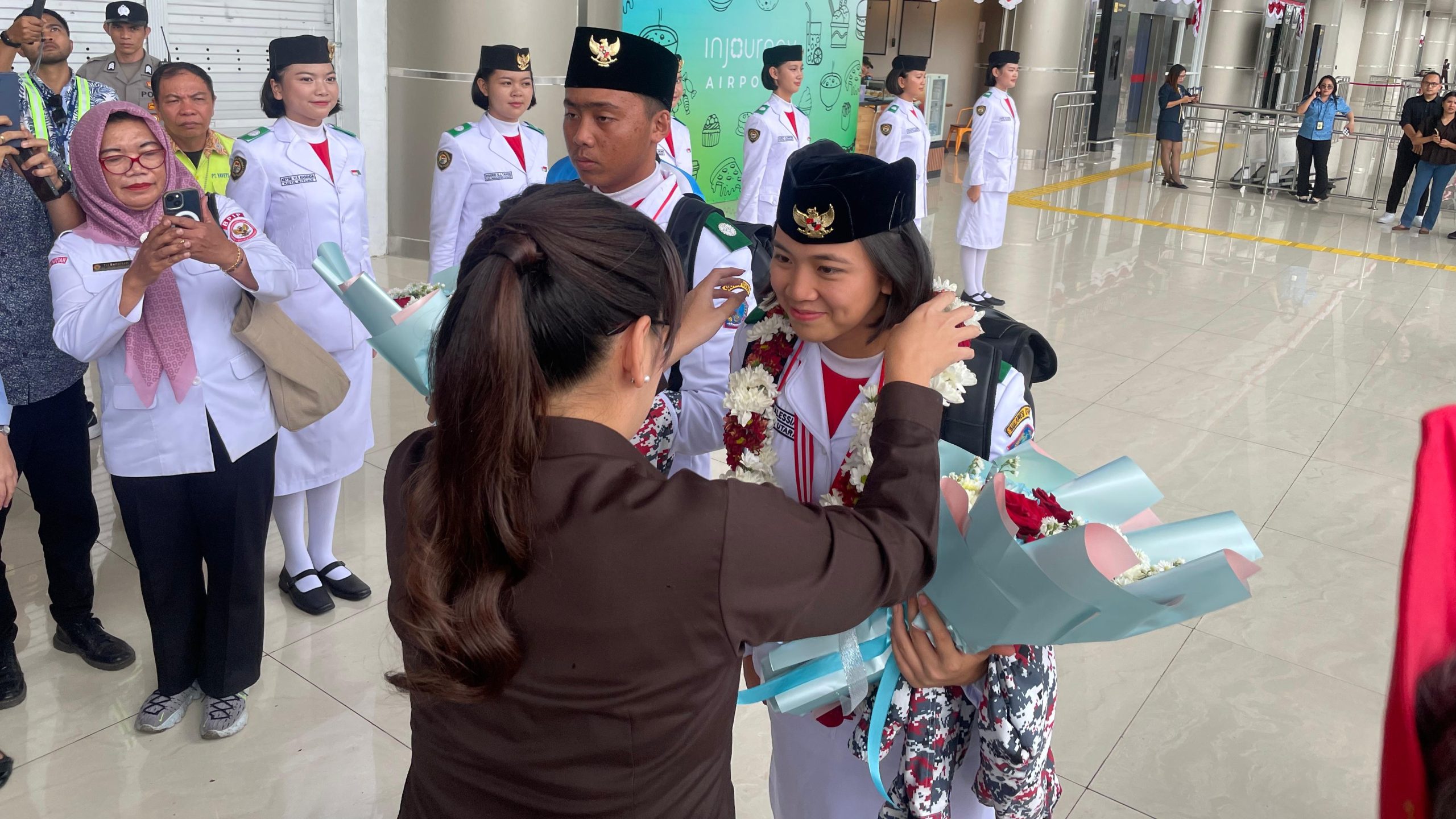 Manado – Wakil Walikota Tomohon Sendy GA Rumajar SE MIKom menyambut kembalinya Bianca Alessia Christabella Lantang usai bertugas sebagai Paskibraka Nasional pada Upacara Peringatan HUT ke-80 Proklamasi Kemerdekaan RI di Istana Merdeka, sebagai pembawa baki Bendera Merah Putih, (22/8/2025) di Bandara Sam Ratulangi Manado.